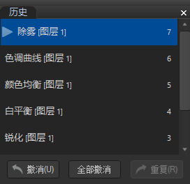 您可以使用「編輯」模式「歷史記錄窗口」來查看對影像所做更改的序列。您還可以使用「歷史記錄窗口」在編輯序列中跳轉并恢復至先前應用的調整。例如,如果您應用了一系列調整(例如顏色調整,然后進行銳化和曝光調整),但是您希望撤消幾個步驟以恢復到只進行顏色調整的相片狀態,則可以使用「編輯」模式「歷史記錄窗口」。