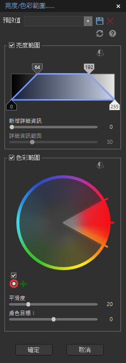 - 在亮度/色彩範圍窗格中,如下所述,設定目標色調與目標色彩的設定。