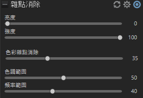 僅對於 RAW 檔案,雜點消除 工具中的滑桿數值具有如下圖所示的預設值。