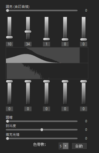 兩組滑塊之間的是從黑到白的兩個水平條。這些條表示最左側的滑塊影響暗淡的色帶。右側的滑塊影響明亮的色帶。移動滑塊會更改該特定色帶的光線強度。