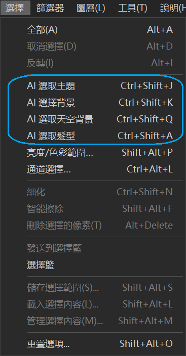 點擊 選擇 | AI 選擇頭髮 或按下 Ctrl + Shift + A。