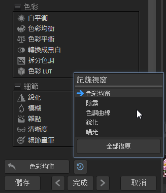 您可以使用「編輯」模式「歷史記錄窗口」來查看對影像所做更改的序列。您還可以使用「歷史記錄窗口」在編輯序列中跳轉并恢復至先前應用的調整。例如,如果您應用了一系列調整(例如顏色調整,然后進行銳化和曝光調整),但是您希望撤消幾個步驟以恢復到只進行顏色調整的相片狀態,則可以使用「編輯」模式「歷史記錄窗口」。